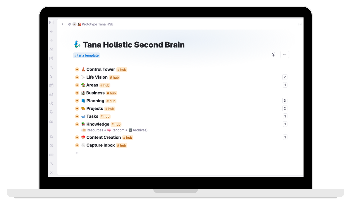 Tana Holistic Second Brain System is an attempt to connect the different areas of your life in a creative, productive and meaningful way. It's a twist to transform your Tana workspace into a powerful living system where your ideas flow with ease, you can retrieve anything and you consistently get work done.